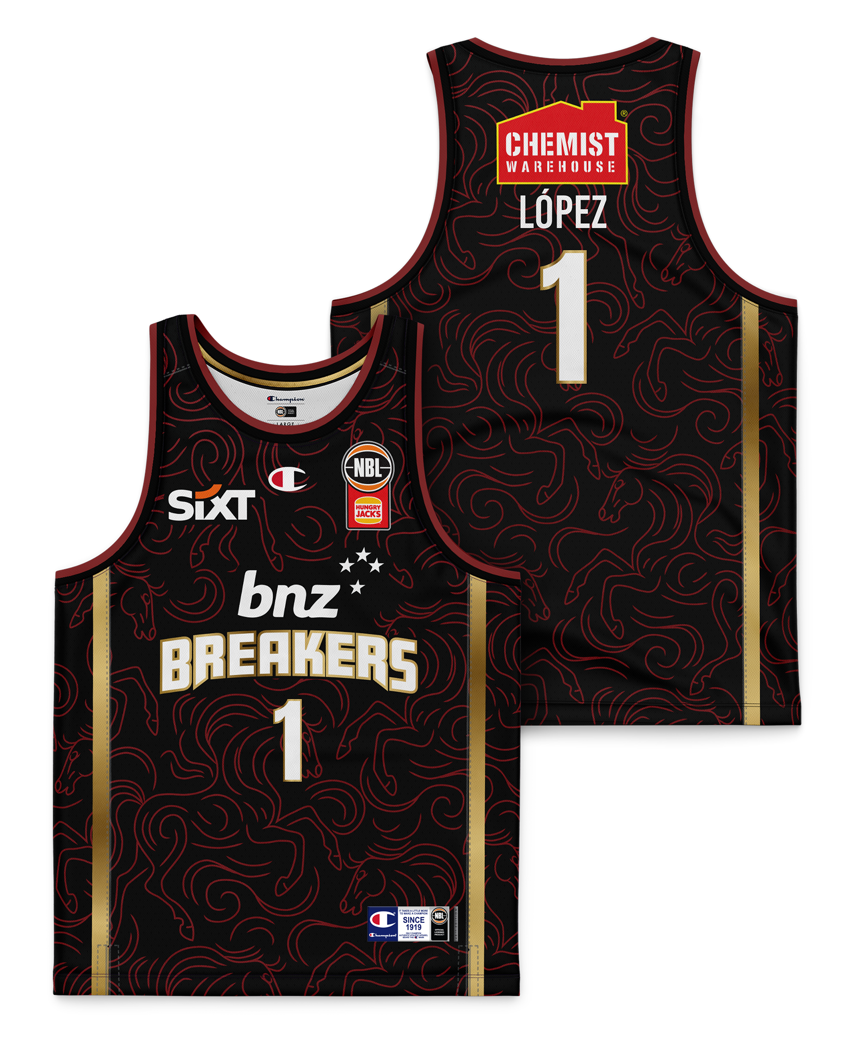 Pick up your New Zealand Breakers 25/26 Lunar New Year Jersey - Karim Lopez to join the Breakers as we enter a new Lunar New Year. This special edition Breakers jersey celebrates Lunar New Year 2026: the Year of the Horse. A symbol of vitality, freedom, and forward motion, the horse comes to life through flowing design lines inspired by 马踏飞燕 (mǎ tà fēi yàn / the flying horse) capturing speed with grace like a fast break unfolding. Finished in red (fortune), gold (prosperity), and black (NZ Breakers identity), it’s a statement of culture, community, and basketball energy.